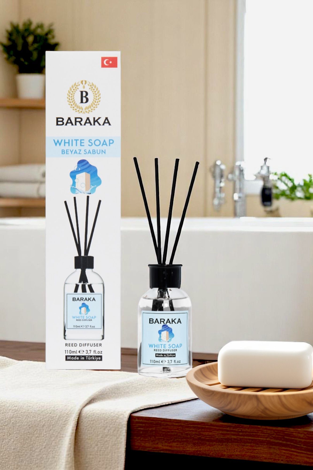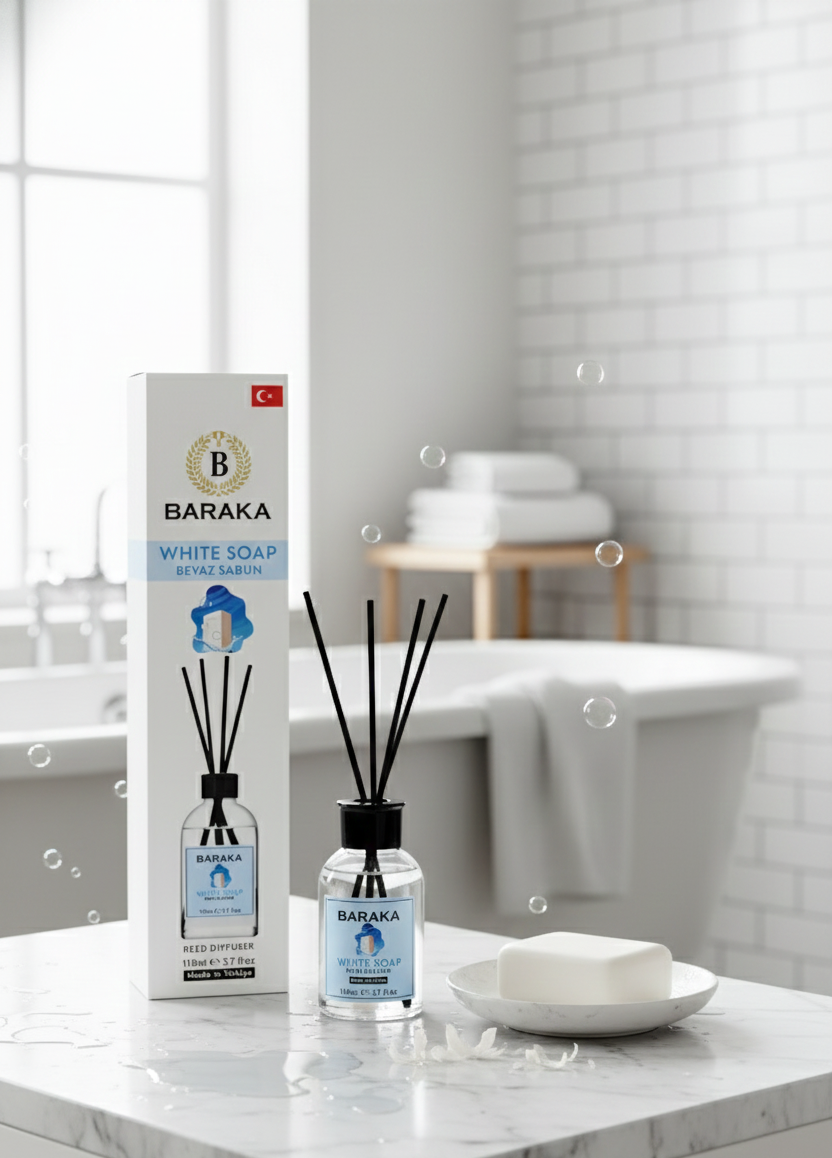 Baraka 110 ml Beyaz Sabun Çubuklu Oda Kokusu, temiz ve ferah beyaz sabun aromasıyla yaşam alanlarınıza taze, huzur verici ve davetkâr bir atmosfer kazandırır. Fiber çubukları sayesinde kokuyu dengeli şekilde yayar, uzun süre kalıcıdır ve modern tasarımıyla her ortama uyum sağlar.