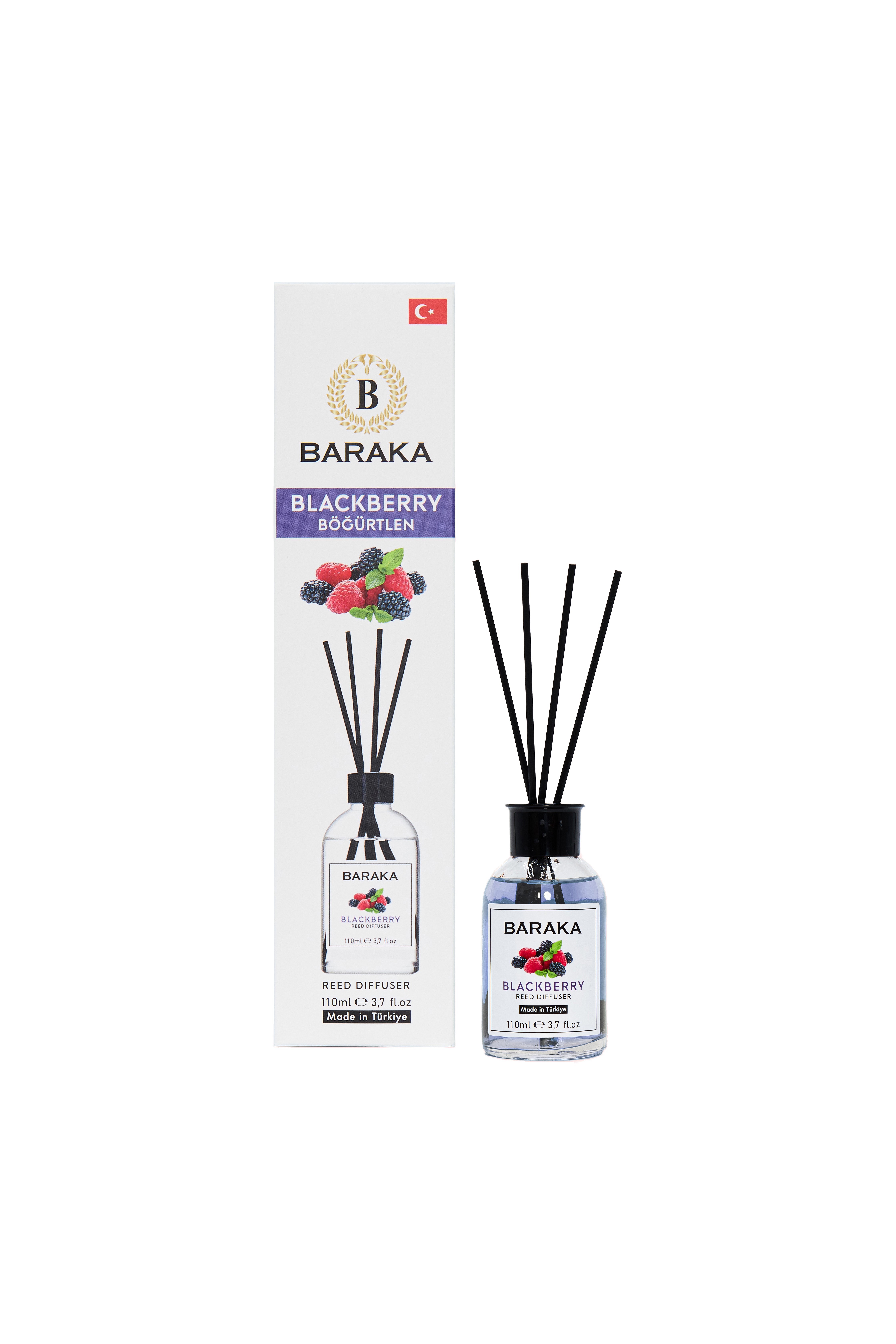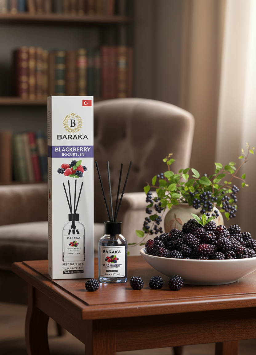 Baraka 110 ml Böğürtlen Çubuklu Oda Kokusu, tatlı ve ferah böğürtlen aromasıyla yaşam alanlarınıza canlı, neşeli ve davetkâr bir atmosfer kazandırır. Fiber çubukları sayesinde kokuyu dengeli şekilde yayar, uzun süre kalıcıdır ve şık tasarımıyla her ortama uyum sağlar.