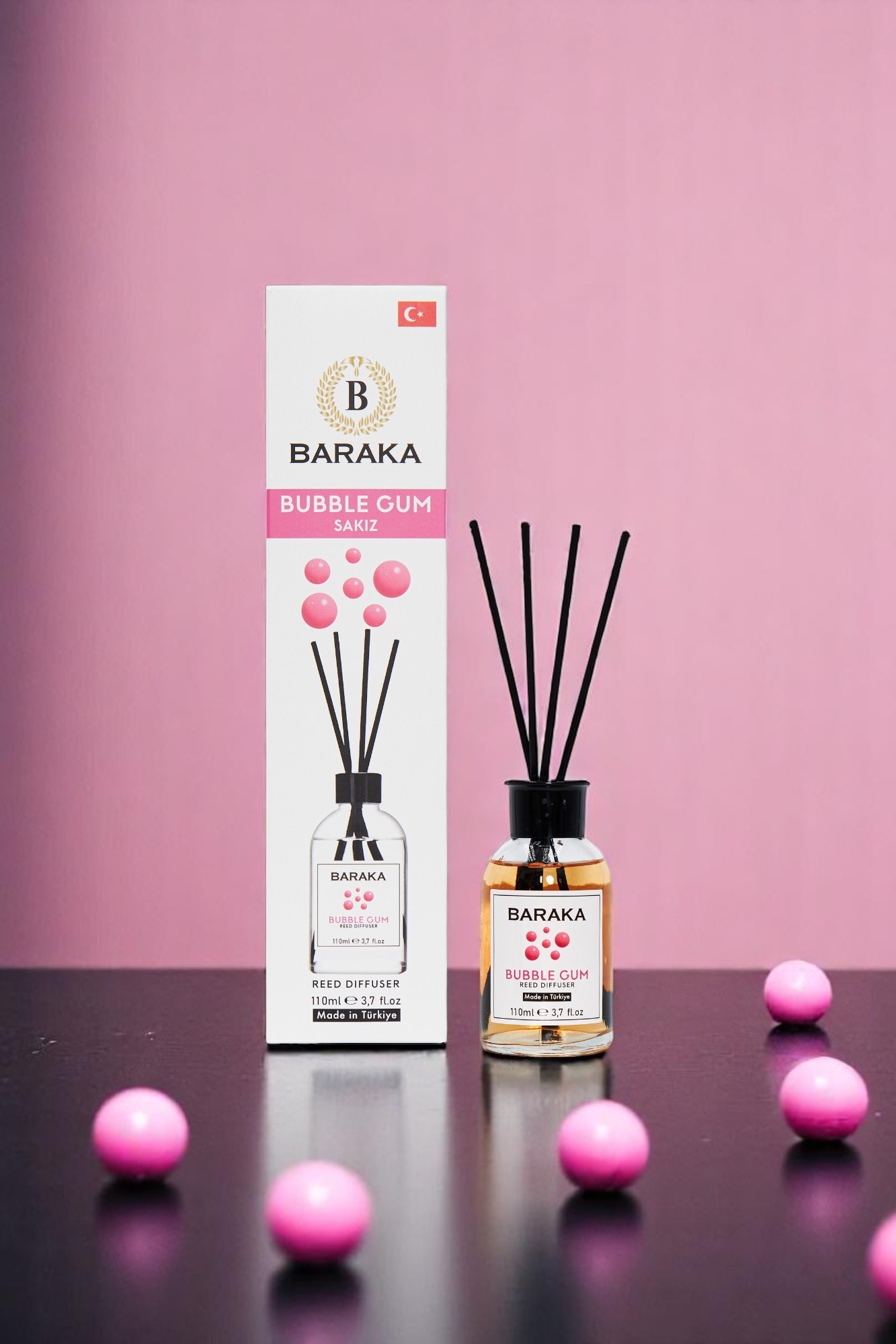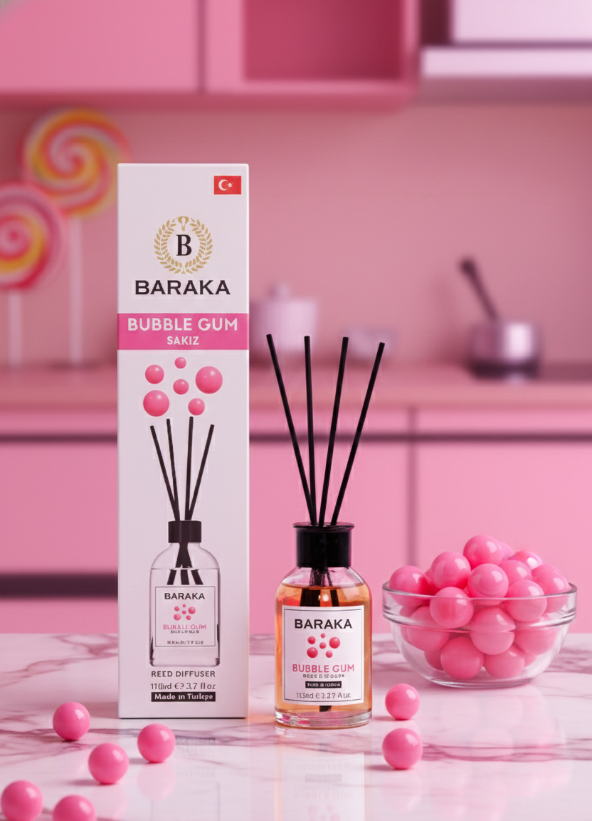 Baraka 110 ml Bubble Gum Çubuklu Oda Kokusu, tatlı, eğlenceli ve neşeli sakız aromasıyla yaşam alanlarınıza enerjik, canlı ve davetkâr bir atmosfer kazandırır. Fiber çubukları sayesinde kokuyu dengeli şekilde yayar, uzun süre kalıcıdır ve modern tasarımıyla her ortama uyum sağlar.