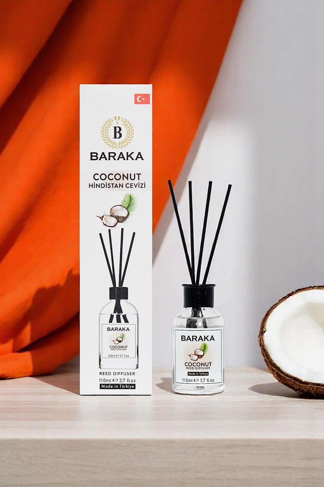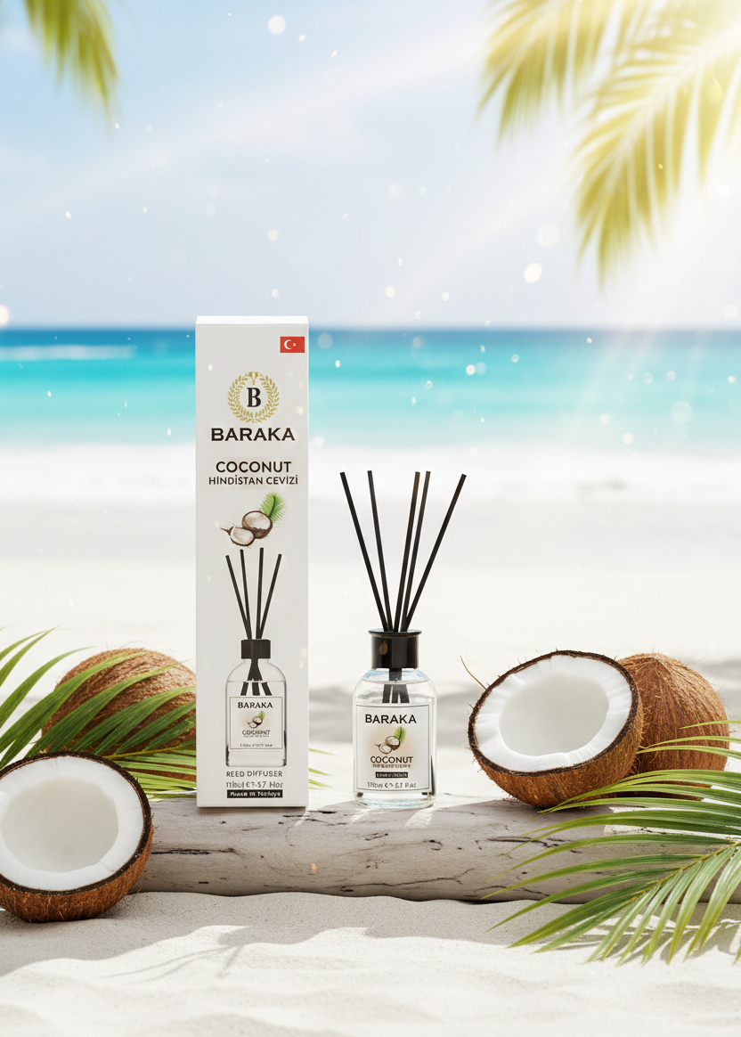 Baraka 110 ml Coconut Çubuklu Oda Kokusu, tropikal ve ferah hindistancevizi aromasıyla yaşam alanlarınıza sıcak, huzur verici ve tatlı bir atmosfer kazandırır. Fiber çubukları sayesinde kokuyu dengeli şekilde yayar, uzun süre kalıcıdır ve şık tasarımıyla her ortama uyum sağlar.