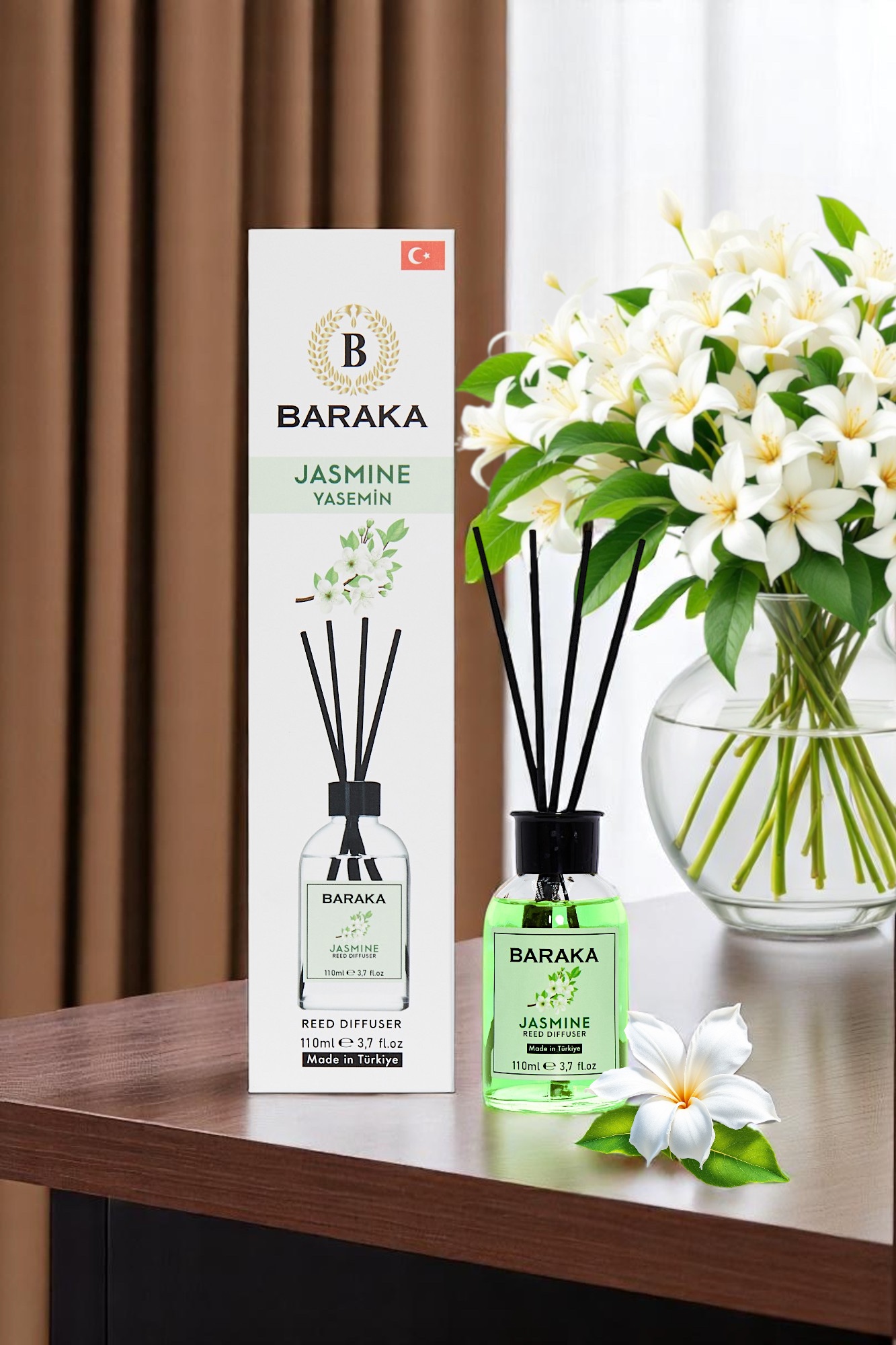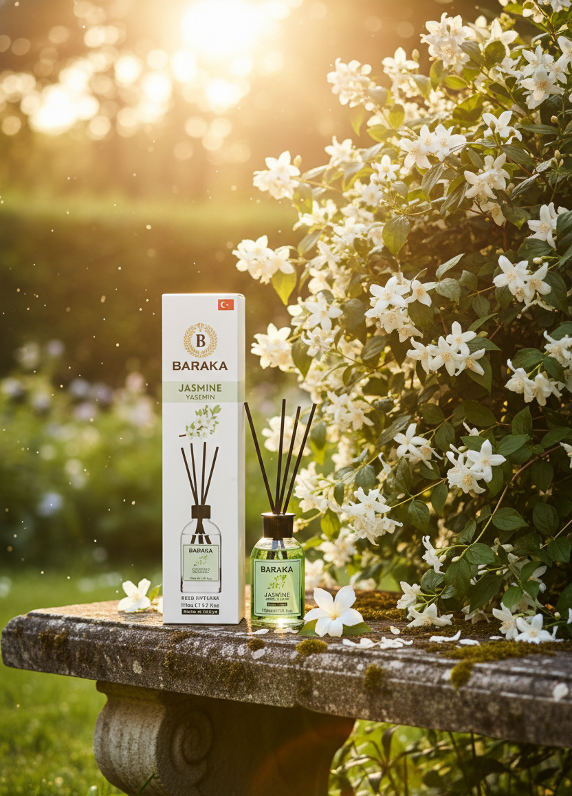 Baraka 110 ml Jasmine Çubuklu Oda Kokusu, zarif ve tatlı yasemin aromasıyla yaşam alanlarınıza ferah, huzur verici ve sofistike bir atmosfer kazandırır. Fiber çubukları sayesinde kokuyu dengeli şekilde yayar, uzun süre kalıcıdır ve şık tasarımıyla her ortama uyum sağlar.