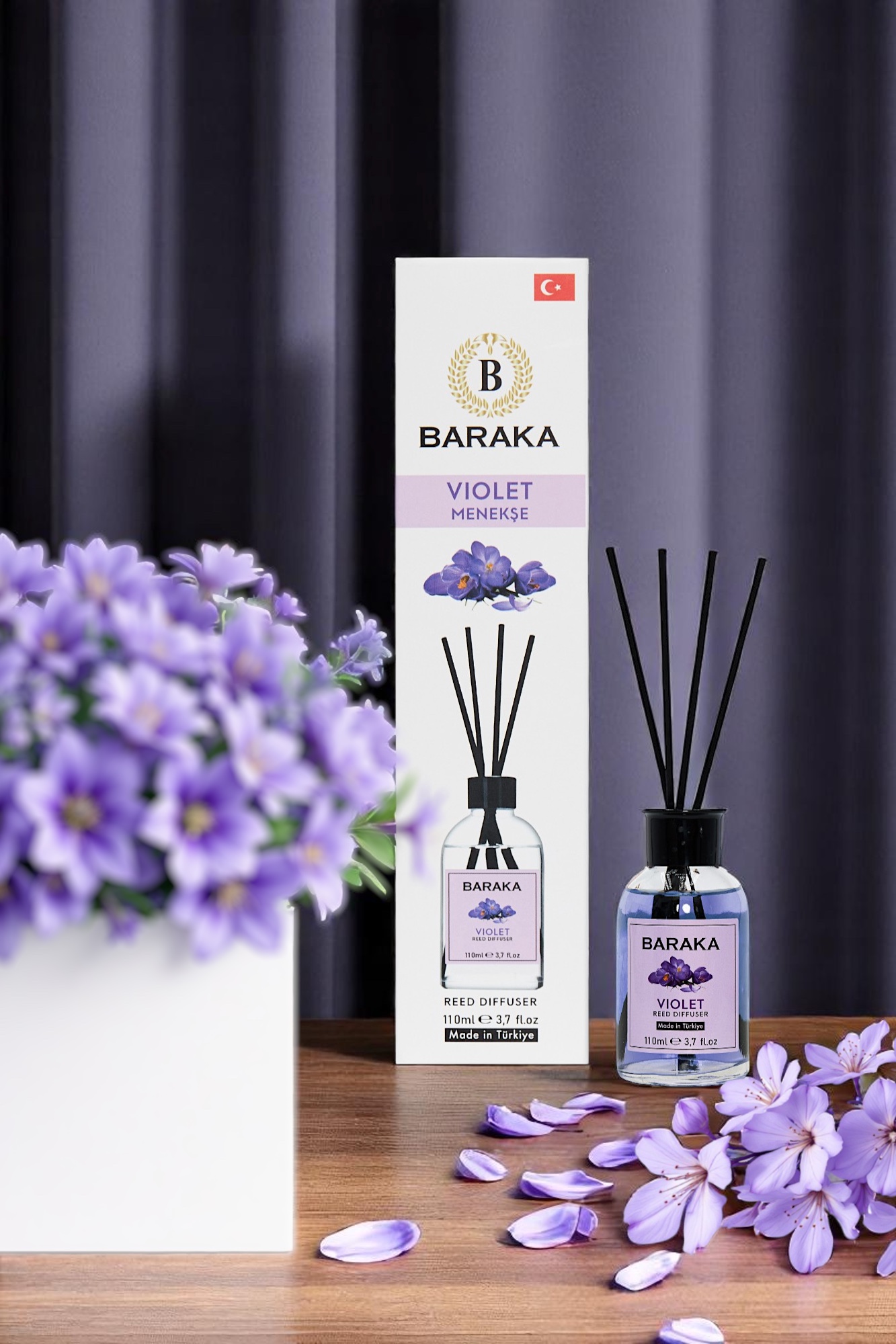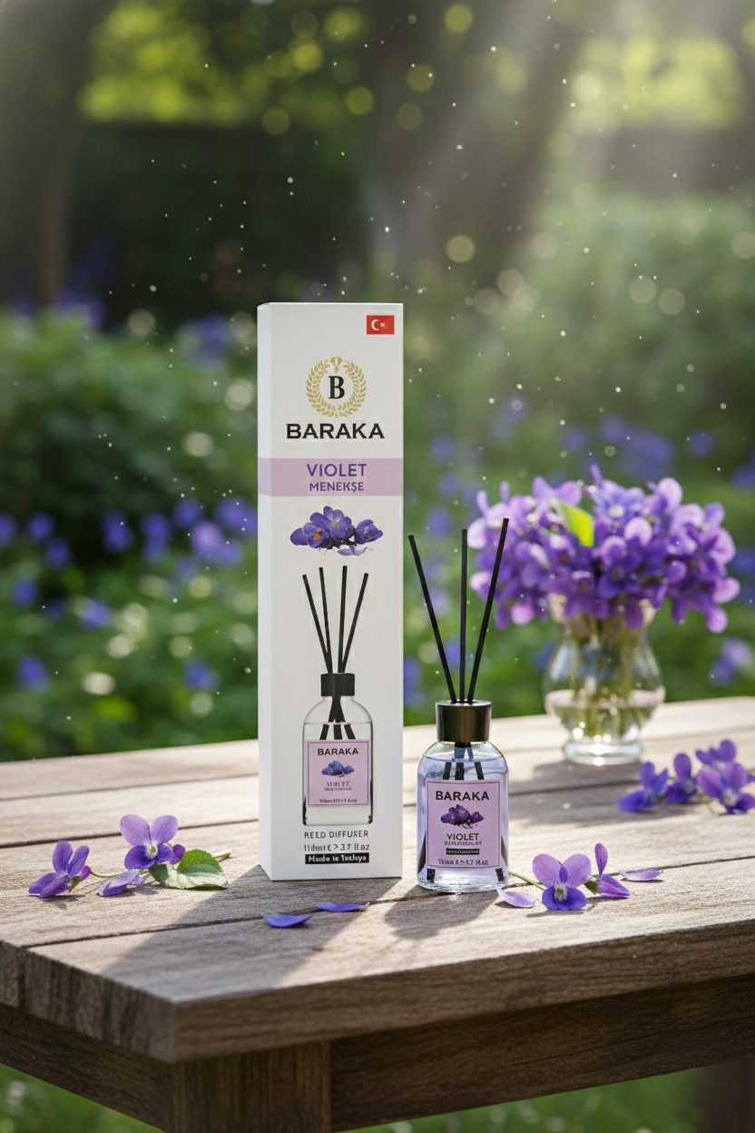 Baraka 110 ml Menekşe Çubuklu Oda Kokusu, zarif ve taze menekşe aromasıyla yaşam alanlarınıza ferah, huzur verici ve sofistike bir atmosfer kazandırır. Fiber çubukları sayesinde kokuyu dengeli şekilde yayar, uzun süre kalıcıdır ve şık tasarımıyla her ortama uyum sağlar.