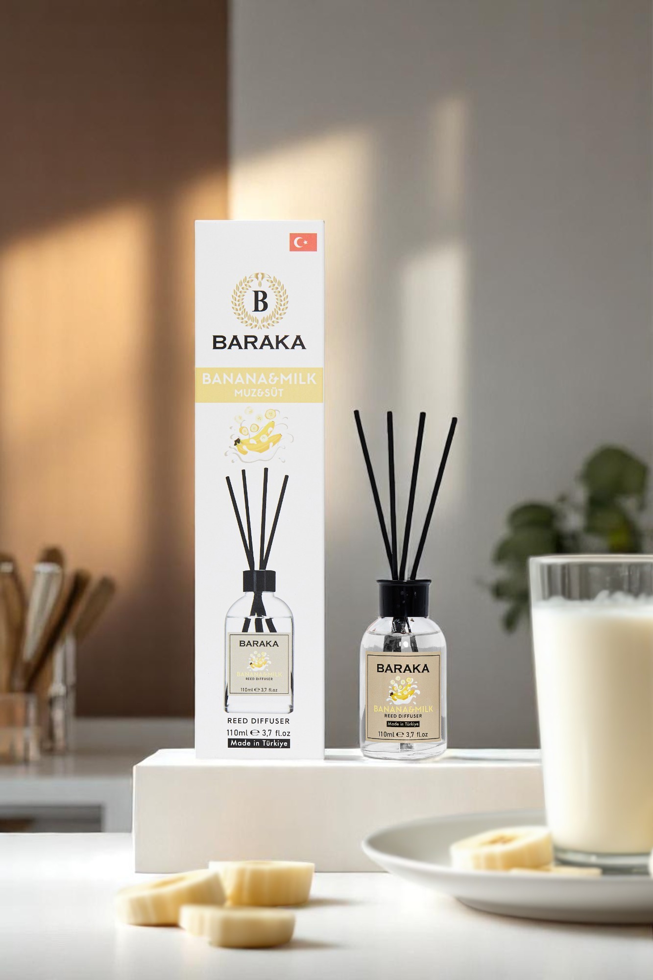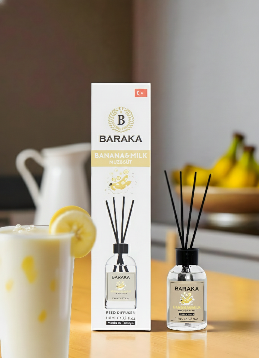 Baraka 110 ml Muz & Süt Çubuklu Oda Kokusu, yumuşak, tatlı ve huzur verici muz & süt aromasıyla yaşam alanlarınıza sıcak, rahatlatıcı ve davetkâr bir atmosfer kazandırır. Fiber çubukları sayesinde kokuyu dengeli şekilde yayar, uzun süre kalıcıdır ve şık tasarımıyla her ortama uyum sağlar.