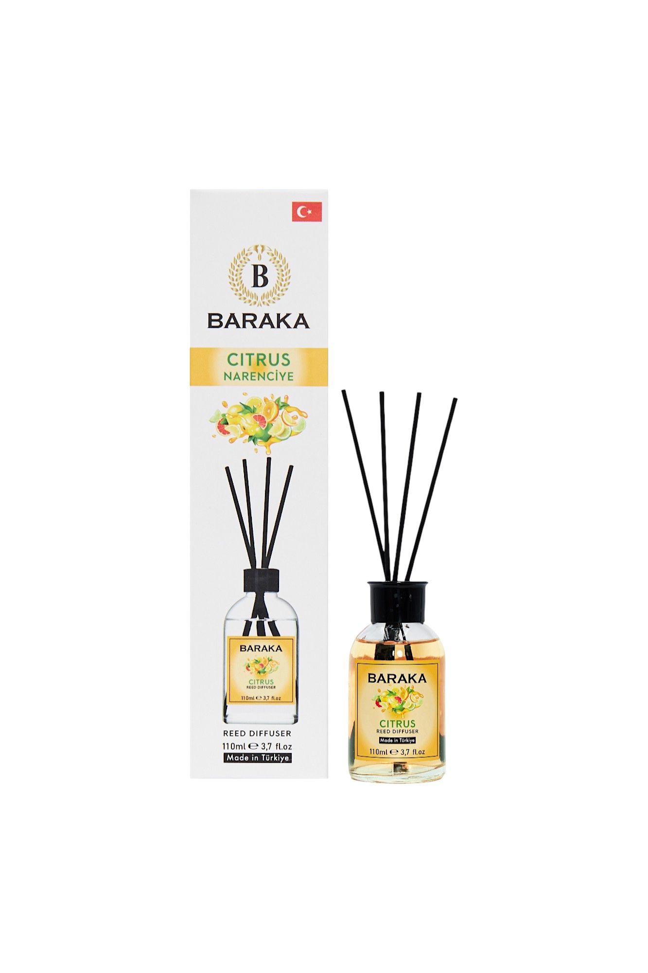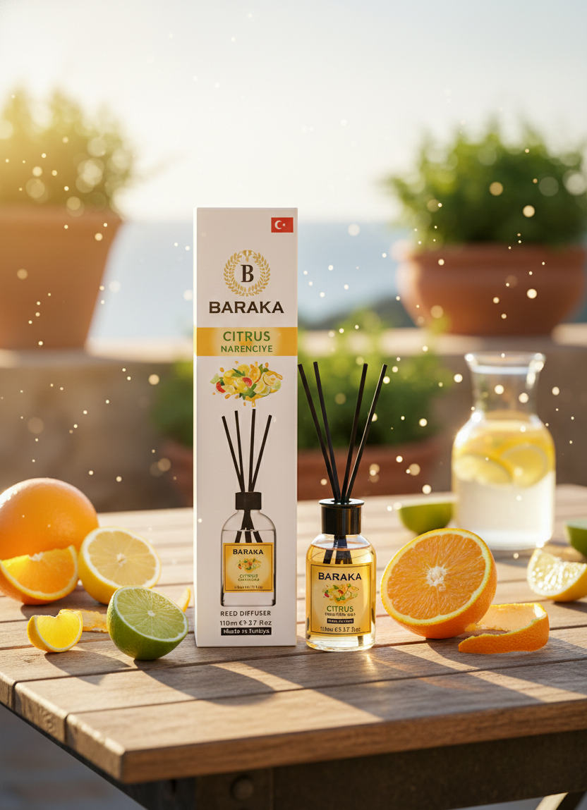Baraka 110 ml Narenciye Çubuklu Oda Kokusu, taze ve canlı narenciye aromasıyla yaşam alanlarınıza ferah, enerjik ve neşeli bir atmosfer kazandırır. Fiber çubukları sayesinde kokuyu dengeli şekilde yayar, uzun süre kalıcıdır ve modern tasarımıyla her ortama uyum sağlar.