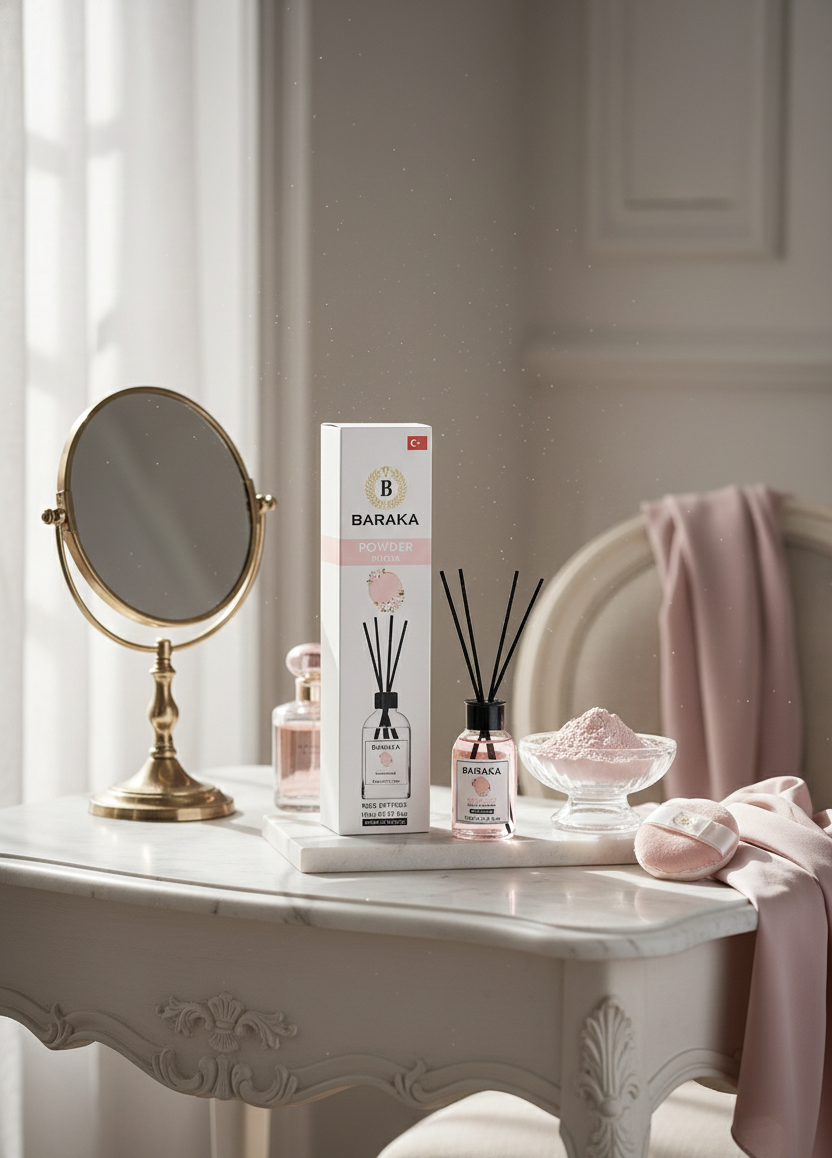 Baraka 110 ml Pudra Çubuklu Oda Kokusu, yumuşak ve tatlı pudra aromasıyla yaşam alanlarınıza ferah, huzur verici ve zarif bir atmosfer kazandırır. Fiber çubukları sayesinde kokuyu dengeli şekilde yayar, uzun süre kalıcıdır ve şık tasarımıyla her ortama uyum sağlar.