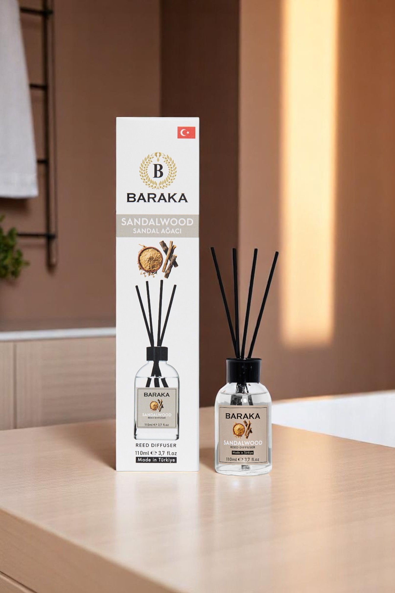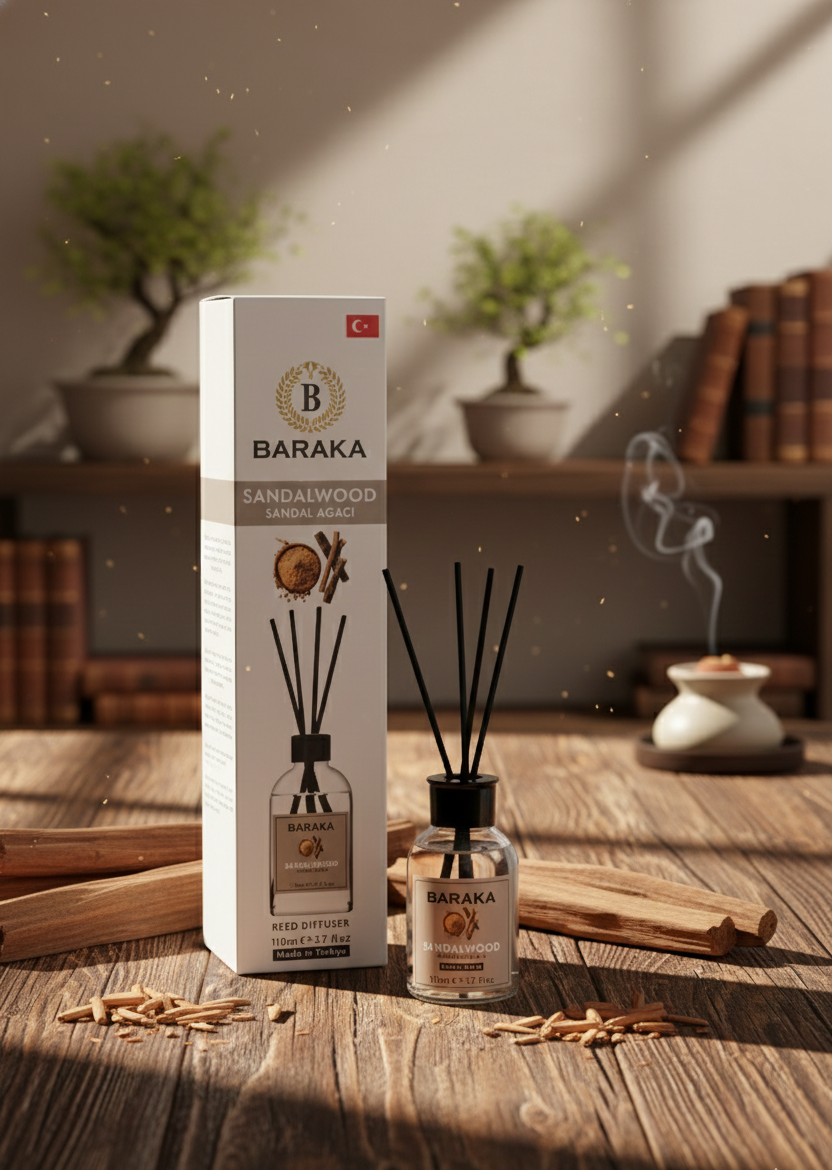 Baraka 110 ml Sandal Wood Çubuklu Oda Kokusu, sıcak, odunsu ve sakinleştirici sandal ağacı aromasıyla yaşam alanlarınıza huzurlu, doğal ve sofistike bir atmosfer kazandırır. Fiber çubukları sayesinde kokuyu dengeli şekilde yayar, uzun süre kalıcıdır ve şık tasarımıyla her ortama uyum sağlar.