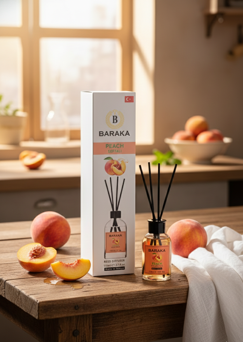 Baraka 110 ml Şeftali Çubuklu Oda Kokusu, tatlı ve ferah şeftali aromasıyla yaşam alanlarınıza neşeli, canlı ve davetkâr bir atmosfer kazandırır. Fiber çubukları sayesinde kokuyu dengeli şekilde yayar, uzun süre kalıcıdır ve modern tasarımıyla her ortama uyum sağlar.