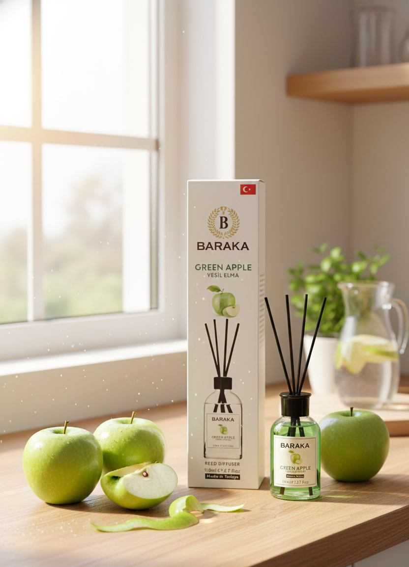 Baraka 110 ml Yeşil Elma Çubuklu Oda Kokusu, taze, ferah ve hafif ekşi yeşil elma aromasıyla yaşam alanlarınıza canlı, enerjik ve doğal bir atmosfer kazandırır. Fiber çubukları sayesinde kokuyu dengeli şekilde yayar, uzun süre kalıcıdır ve modern tasarımıyla her ortama uyum sağlar.